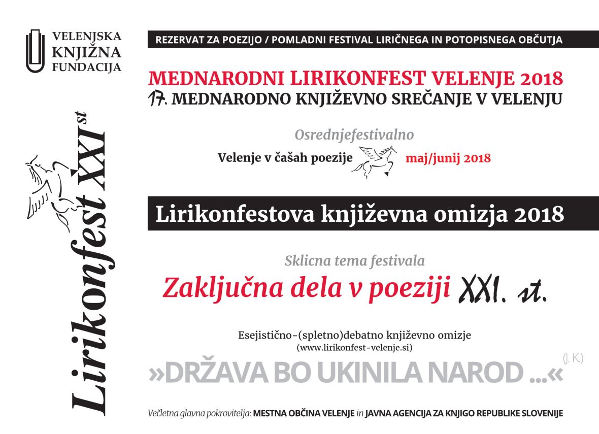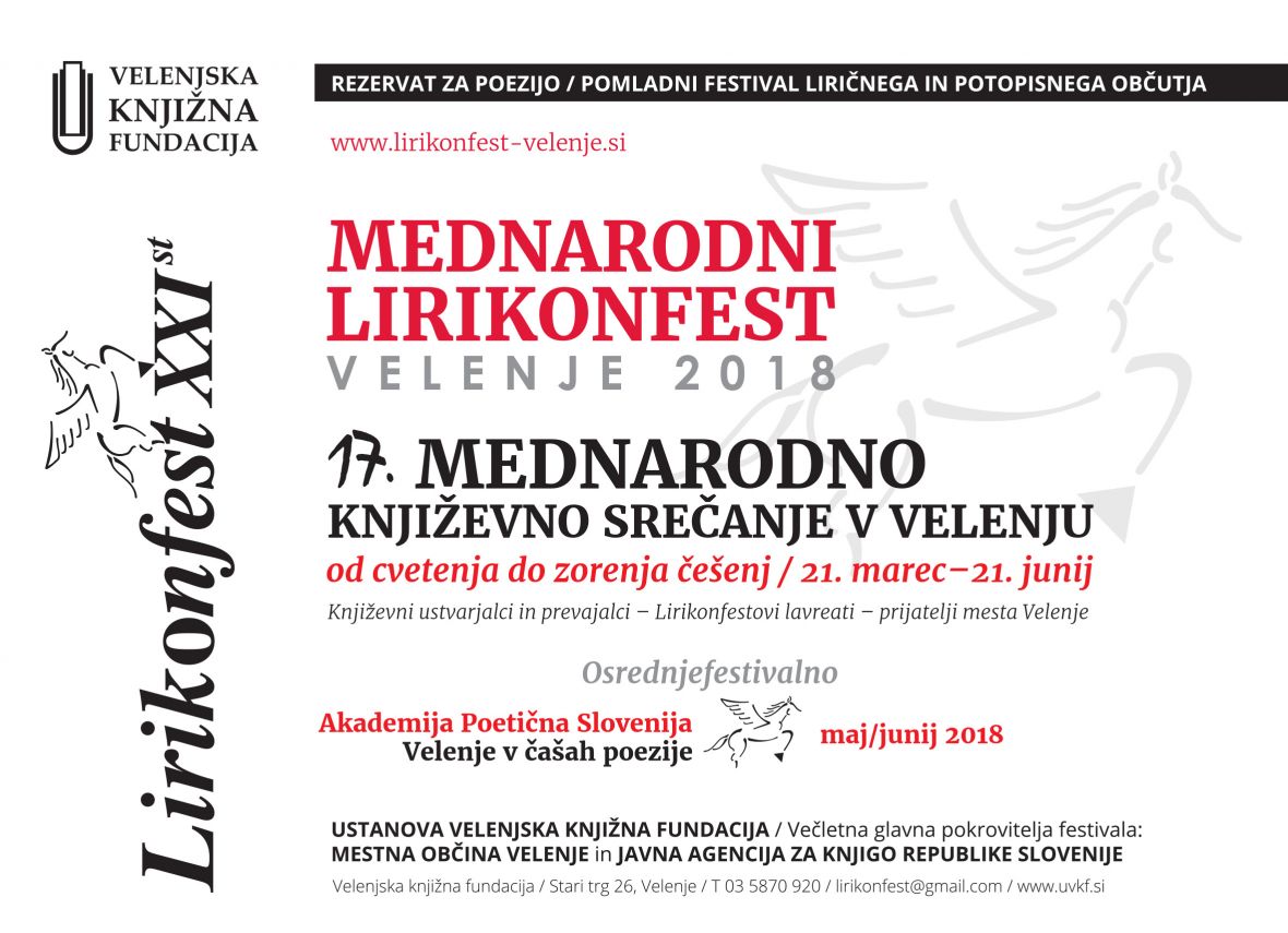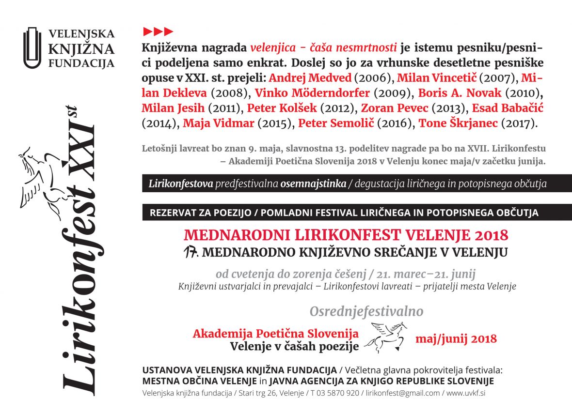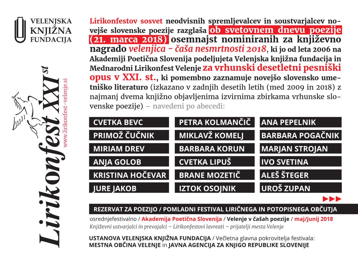 Lirikonfestov sosvet neodvisnih spremljevalcev in soustvarjalcev novejše slovenske poezije razglaša ob svetovnem dnevu poezije (21. marca 2018) osemnajst nominiranih za književno nagrado velenjica - čaša nesmrtnosti 2018, ki jo od leta 2006 na Akademiji Poetična Slovenija podeljujeta Velenjska knjižna fundacija in Mednarodni Lirikonfest Velenje za vrhunski desetletni pesniški opus v XXI. st., ki pomembno zaznamuje novejšo slovensko umetniško literaturo (izkazano v zadnjih desetih letih (med 2009 in 2018) z najmanj dvema knjižno objavljenima izvirnima zbirkama vrhunske slovenske poezije) – navedeni po abecedi: