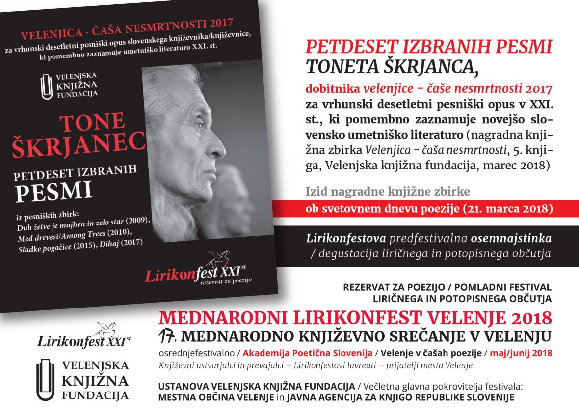 OB DNEVU POEZIJE 2018 – KNJIŽNI IZID PETDESETIH IZBRANIH PESMI TONETA ŠKRJANCA, dobitnika velenjice - čaše nesmrtnosti 2017 za vrhunski desetletni pesniški opus v XXI. st., ki pomembno zaznamuje novejšo slovensko umetniško literaturo (nagradna knjižna zbirka Velenjica - čaša nesmrtnosti, 5. knjiga, Velenjska knjižna fundacija)