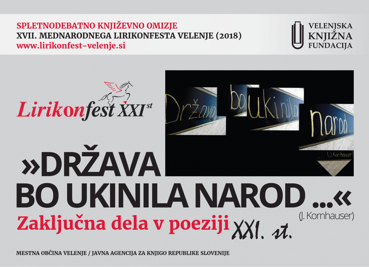 Na spletnih straneh Lirikonfesta/Velenjske knjižne fundacije in Čitalnice Pri pesniški duši – www.lirikonfest-velenje.si ter vzporedno na družbenem omrežju Facebook – www.facebook.com/Lirikonfest – objavljamo kratke refleksije festivalno izbranih slovenskih in tujih književnih ustvarjalcev ter prevajalcev XVII. Mednarodnega Lirikonfesta Velenje (2018) na temo spletnodebatno zastavljenega književnega omizja »DRŽAVA BO UKINILA NAROD« (J. Kornhauser) – ZAKLJUČNA DELA V POEZIJI XXI. ST. / Debatna izhodišča (aktualna vprašanja književnega ustvarjanja, vrednotenja in mednarodnega povezovanja oz. posredovanja):