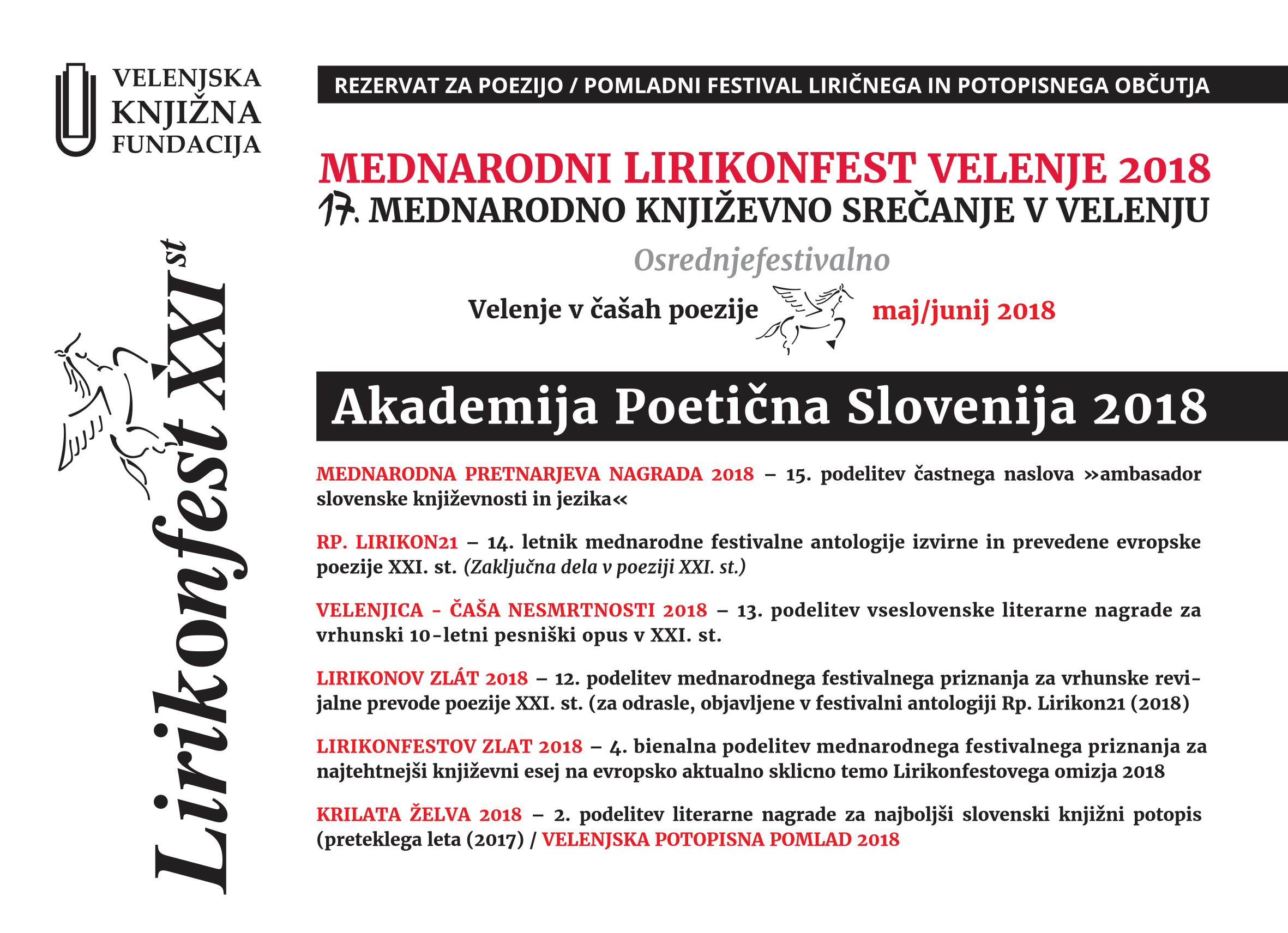 Dobitnika mednarodne Pretnarjeve nagrade 2018 (častnega naslova »ambasador slovenske književnosti in jezika«) ter Lirikonovega zlata 2018 (festivalne plakete za vrhunske revijalne prevode evropske poezije XXI. st. (v letu 2018 razpisno iz slovenščine v nemščino, obj. v festivalni antologiji Rp. Lirikon21), bosta znana 9. maja.